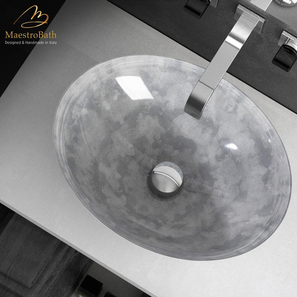This crystal wash basin is perfected by the "Florence Glass Atelier" project which allows for colors and textures to be embedded within the crystal, making it sturdy, hygienic and of course, fashionably beautiful. Luna is in the shape of an oval bowl and also available in Yellow finish. It will look brilliant on top of your bathroom counter.