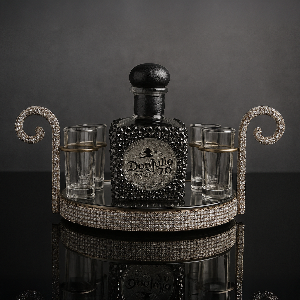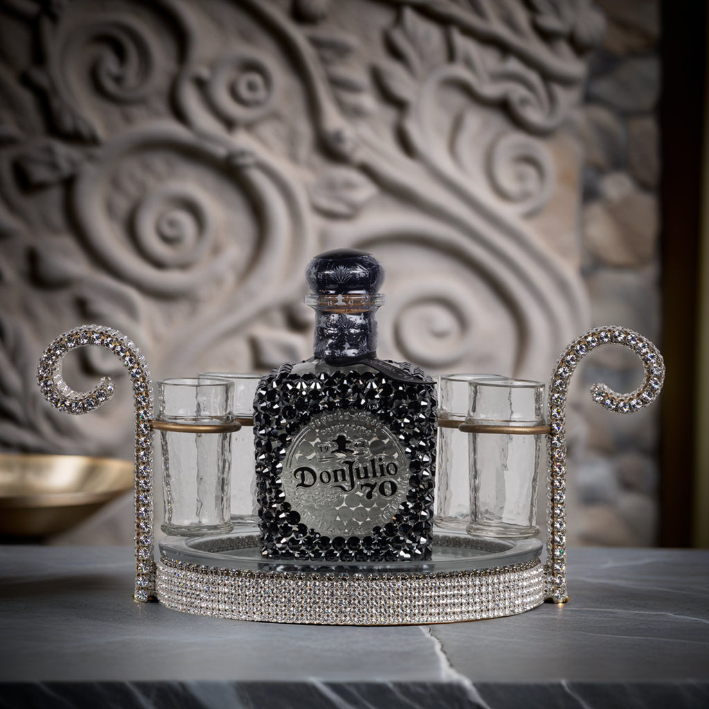 Each set features a signature Don Julio 70 bottle adorned in hand-placed rhinestones, radiating elegance in every finish – from shimmering Silver Ice to bold Sapphire Blue and seductive Midnight Black. Nestled in a lavish crystal-embellished round tray with four premium glass shot glasses, this piece is more than a bar accessory – it’s a centerpiece.